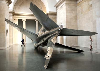 The London-based artist has installed two decommissioned fighter planes in the neoclassical Duveens Gallery. One, upside down, has been stripped of paint and now has a mirror-like finish. The other hangs from its tail fin and has been painted with feathers.