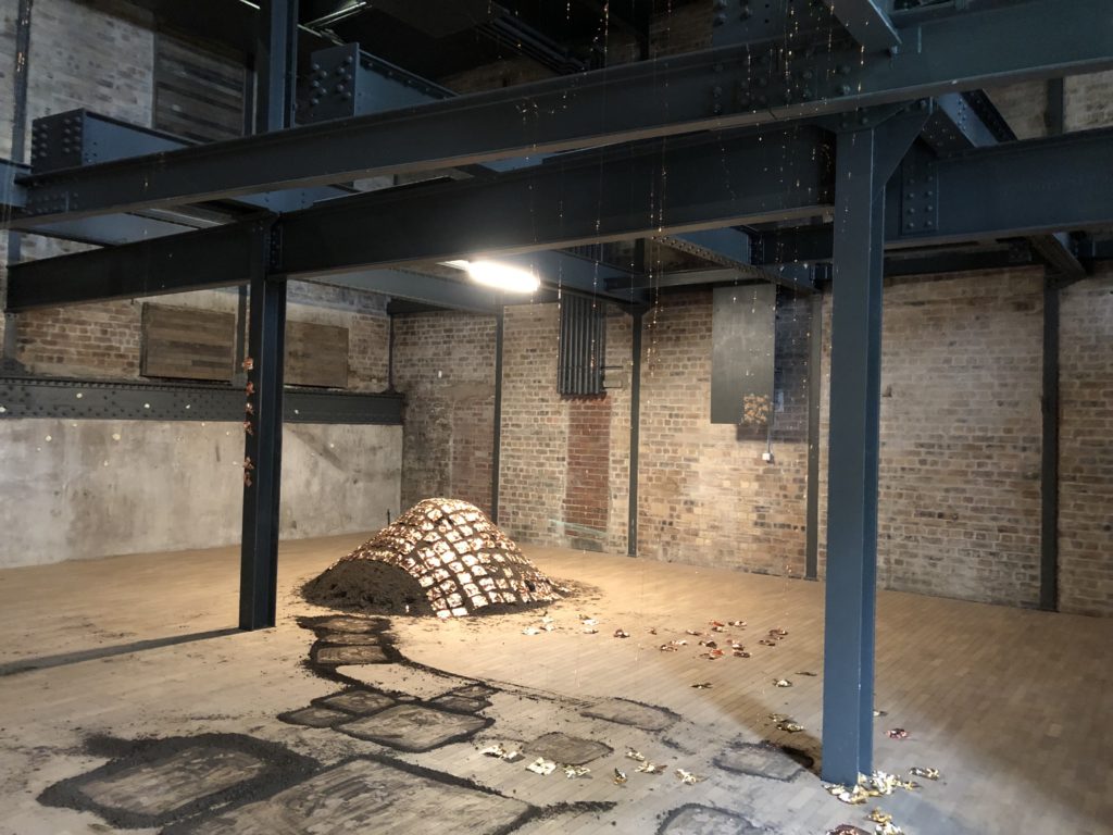 At the back of this stage, a mound of this dark earth looms. Foil wraps decorate it, row upon row like contour lines. They seem to armour this indistinct form. They certainly aestheticize it.