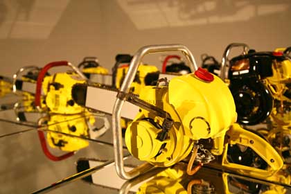 Sanity Assassin is a three screen video installation with a sinister sculptural element, a series of chainsaws atop a mirrored plinth. This display, based on a real corporate showroom, was inspired by a visit to LA, where the piece was also filmed.