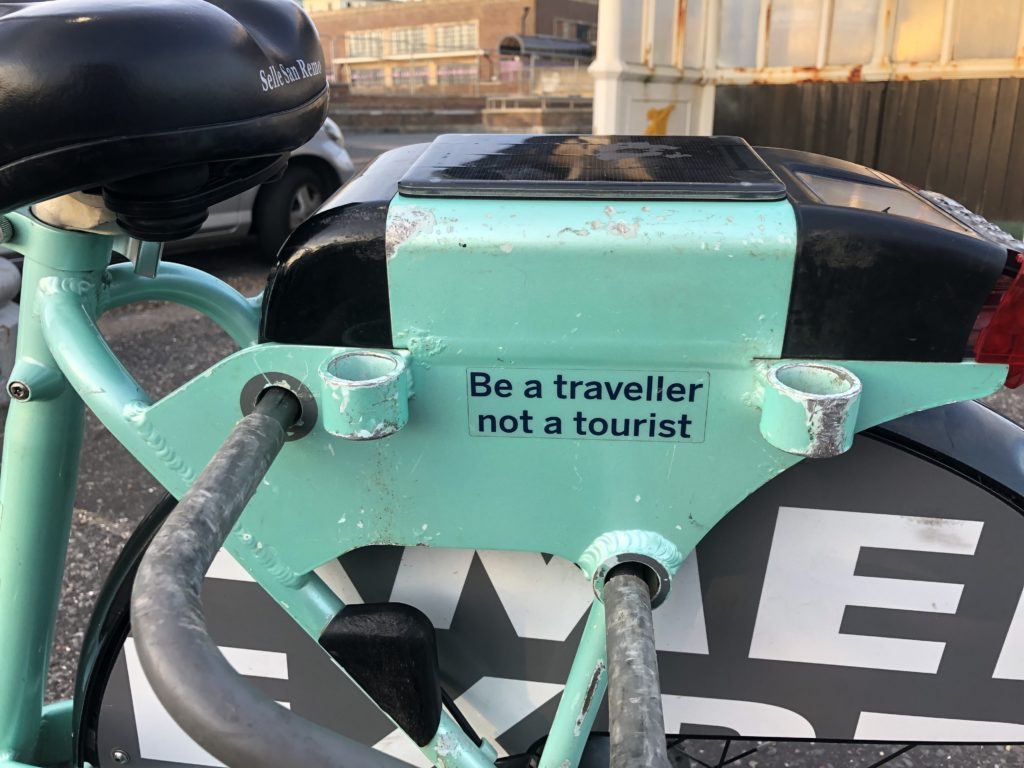 So I was stopped in my tracks, in my hometown, on the beach, where I was neither tourist nor traveller by the exhortation on the side of BTN Bike Share hire bikes. You can read it in the photograph above. Unlike the most iconic Diesel campaigns from the nineties, it was not clear to me who was being addressed here. Surely no one living in Brighton. Day trippers are most likely, but it’s incredibly pretentious to consider yourself a traveller in a town set up to cater for hedonistic Londoners.