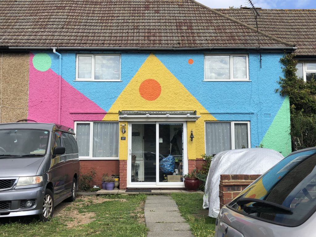 I can only say we did experience a simple act of wonder to find bright geometric painting on the side of characteristically grey council housing. We found five such interventions, each resonating with the others, and each one a testament to the occupants, brave enough to foray into exhibiting contemporary art on the side of their traditional housing.
